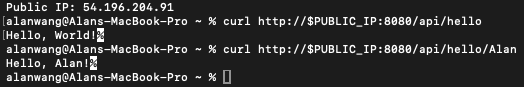 # Basic test curl http://$PUBLIC_IP:8080/api/hello # Test with your name curl http://$PUBLIC_IP:8080/api/hello/YourName