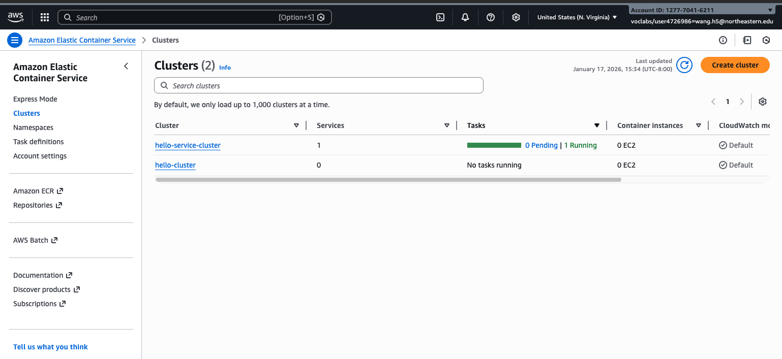 - The ECS console window with the deployed task in the Running State
