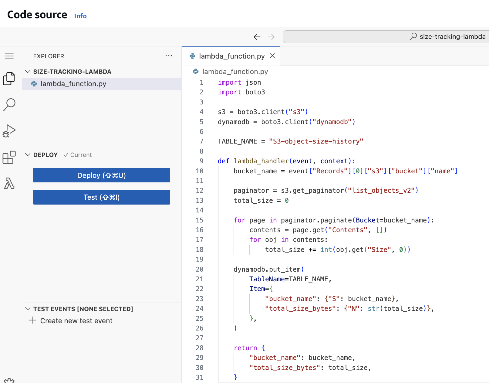 lambda_handler(event, context) - This is the logic (compute bucket size, write DynamoDB, make plot…)
