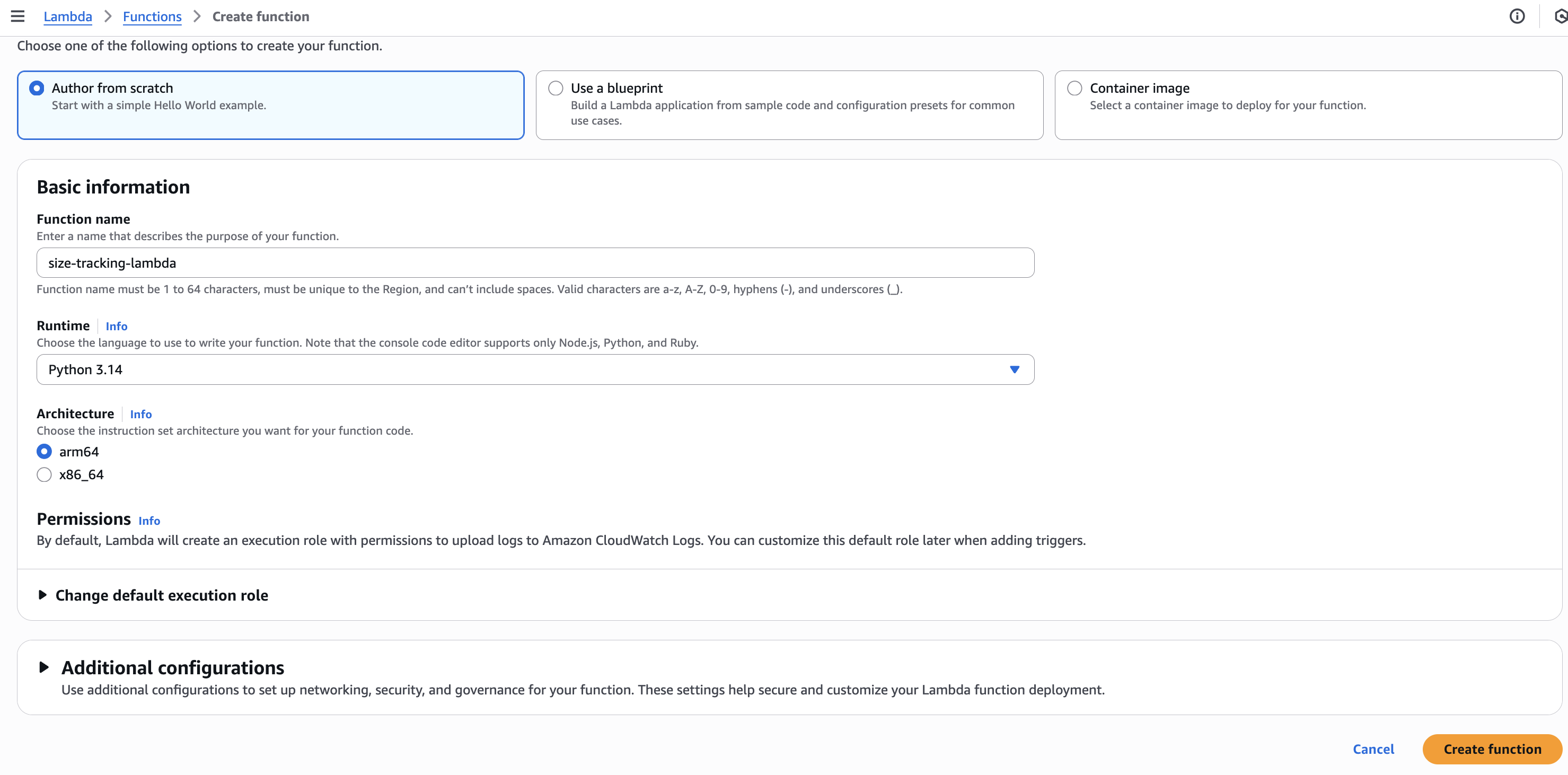 - Memory, timeout, environment variables, architecture (x86_64/arm64)