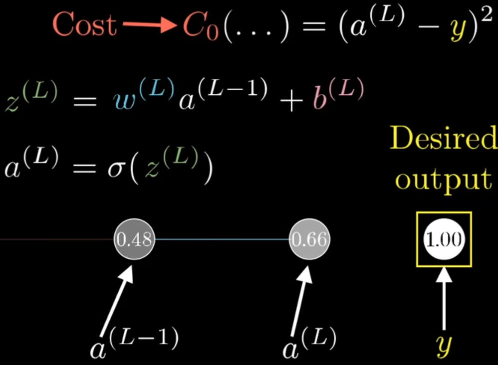 = \frac{\partial C_0}{\partial a^L} \cdot \frac{\partial a^L}{\partial z^L} \cdot \frac{\partial z^L}{\partial w^L} =2(a^L-y)\sigma'(z^L)a^{L-1}$$ This is the gradient of the final-layer weight for one training example. You can read it as three factors: - $2(a^L-y)$ - how wrong the output is - $\sigma'(z^L)$ - how easy the neuron is to push at this point - $a^{L-1}$ - how active the input to this connection is Together, these determine whether the weight should change and by how much. --- # 05:10 From One Training Example to the Whole Dataset So far we computed the cost for a single example, $C_0$. But during training, we optimize the average cost across the dataset:C = \frac{1}{n}\sum_{x} C_x